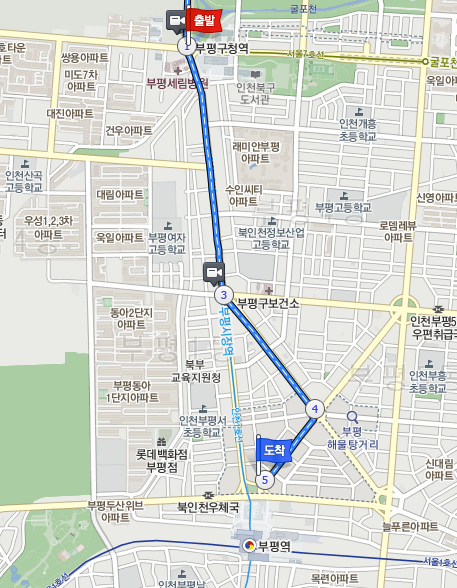 경인로 우회전 후 → 동소정 사거리에서 우회전 → 굴다리 오거리에서 부평역 방향 우회전 → 부평역 사거리에서 부평구청 방면 우회전 후 132m 이동 → 시장으로 우회전 41m 이동 → 도착